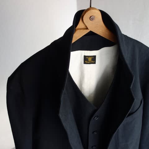 使用している生地の硫化染めの色合いや生地感と見事に調和しています。